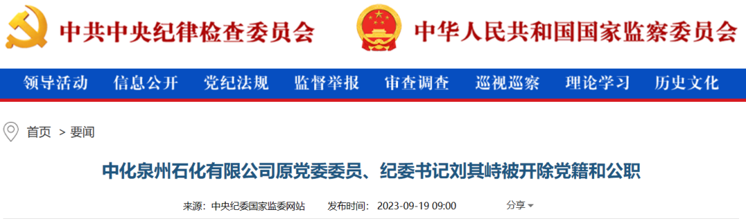 中央紀(jì)委國(guó)家監(jiān)委網(wǎng)站9月19日消息,據(jù)中國(guó)中化控股有限責(zé)任公司紀(jì)檢監(jiān)察組、福建省紀(jì)委監(jiān)委消息:日前,中國(guó)中化控股有限責(zé)任公司紀(jì)檢監(jiān)察組、福建省泉州市監(jiān)委對(duì)中化泉州石化有限公司原黨委委員、紀(jì)委書(shū)記劉其峙嚴(yán)重違紀(jì)違法問(wèn)題進(jìn)行了紀(jì)律審查和監(jiān)察調(diào)查。