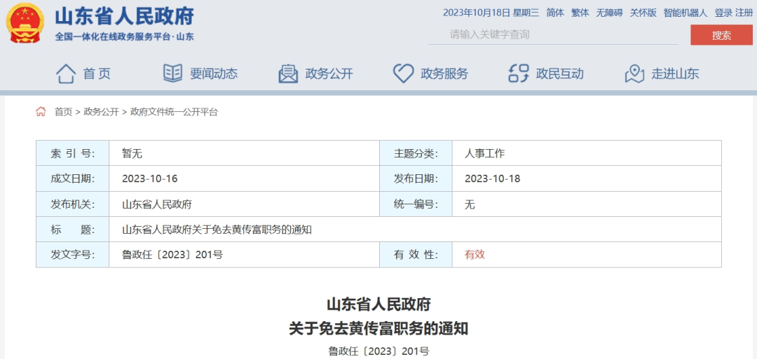 10月18日,山東省人民政府發(fā)布《關于免去黃傳富職務的通知》。