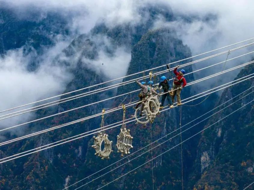國網(wǎng)四川電力施工人員開展川渝特高壓工程輸電線路間隔棒安裝作業(yè)