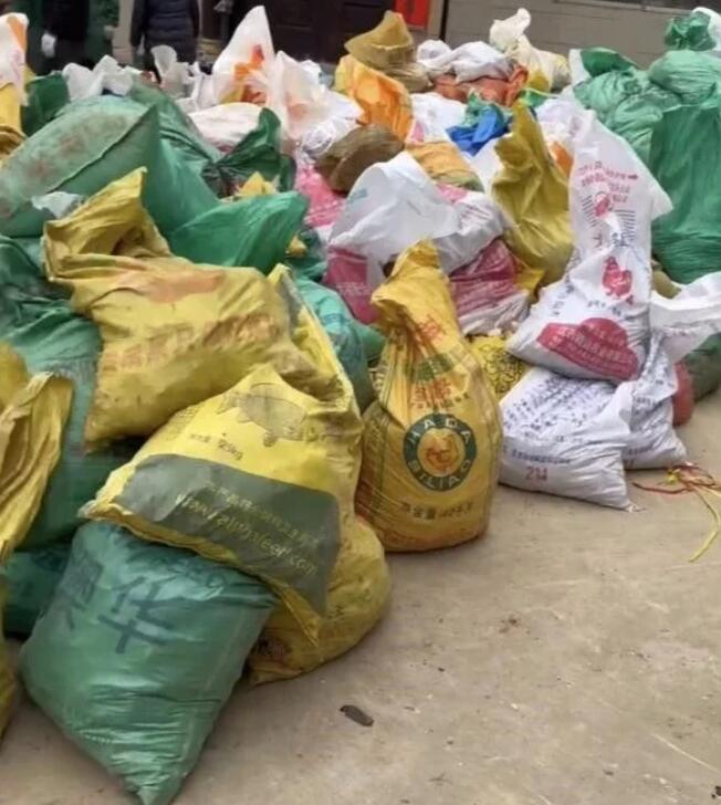 村民挖來的鋰礦石裝進飼料袋,堆在村莊空地上。受訪者供圖