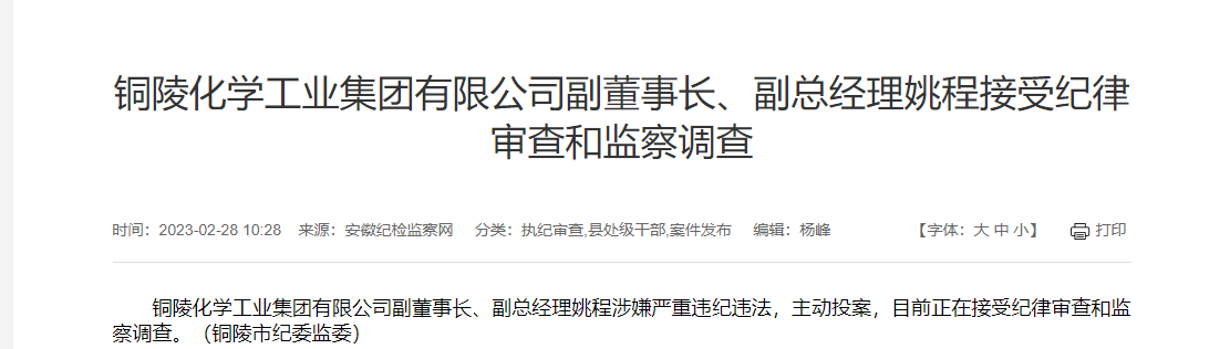 2月28日,安徽紀(jì)檢監(jiān)察網(wǎng)發(fā)布消息,銅陵化學(xué)工業(yè)集團(tuán)有限公司(簡稱“銅化集團(tuán)”)副董事長、副總經(jīng)理姚程涉嫌嚴(yán)重違紀(jì)違法,主動(dòng)投案,目前正在接受紀(jì)律審查和監(jiān)察調(diào)查。