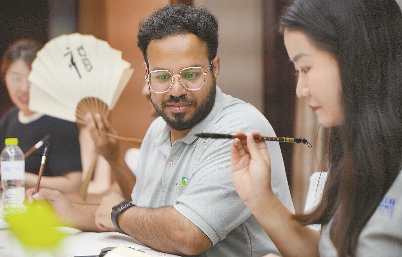 “學(xué)漢字,畫(huà)扇面”活動(dòng)也得到留學(xué)生們的好評(píng)。專(zhuān)業(yè)書(shū)法老師介紹了漢字的起源和發(fā)展,指導(dǎo)他們從基本的運(yùn)筆學(xué)起,最終將“福”字這一學(xué)習(xí)成果展現(xiàn)在各自的扇面上。大家熱情高漲,甚至自主延伸,將中文和阿語(yǔ)結(jié)合。