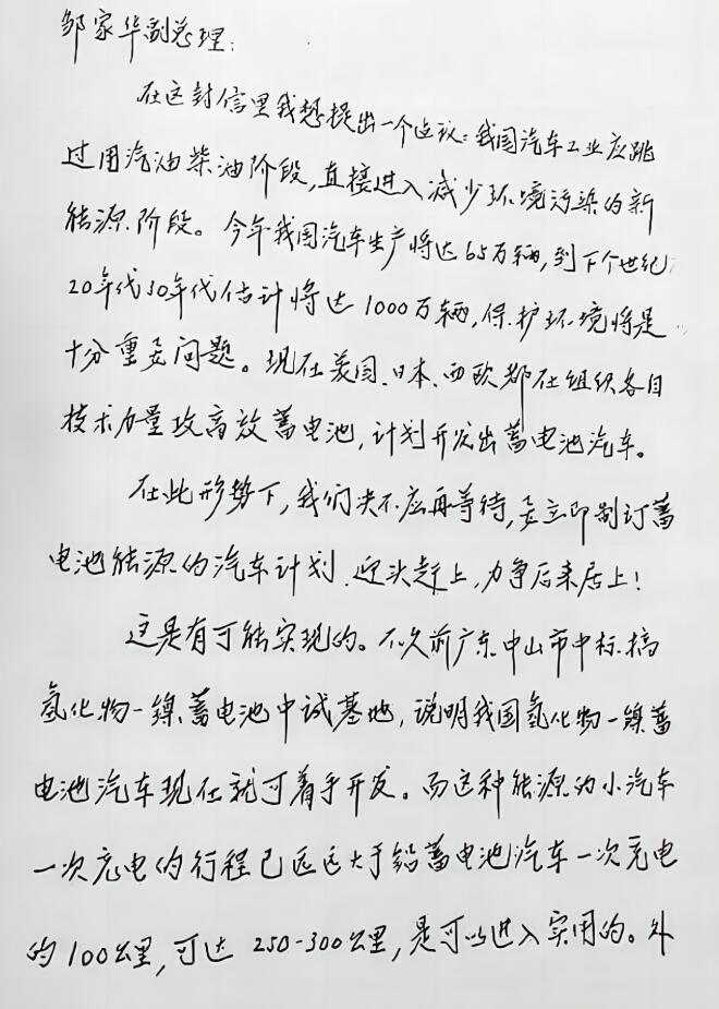 1992年,當(dāng)時(shí)已81歲高齡的錢(qián)學(xué)森寫(xiě)信給時(shí)任副總理鄒家華,提出了一個(gè)高瞻遠(yuǎn)矚的建議:“我國(guó)汽車(chē)工業(yè)應(yīng)跳過(guò)用汽油柴油階段,直接進(jìn)入減少環(huán)境污染的新能源階段……到下個(gè)世紀(jì)20年代保護(hù)環(huán)境將是十分重要問(wèn)題?,F(xiàn)在美國(guó)、日本、西歐都在組織各自技術(shù)力量攻高效蓄電池,計(jì)劃開(kāi)發(fā)出蓄電池汽車(chē)。”