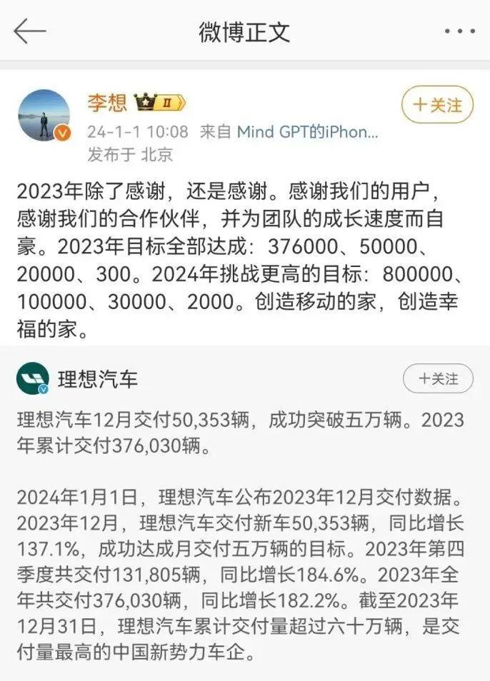 理想汽車董事長兼ceo李想在社交媒體發(fā)聲:“2023年除了感謝,還是感謝。感謝我們的用戶,感謝我們的合作伙伴,并為團(tuán)隊的成長速度而自豪。2023年目標(biāo)全部達(dá)成。”
