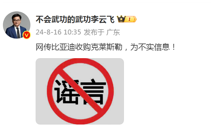 近日,有消息稱,比亞迪正推進收購克萊斯勒。8月16日,比亞迪品牌與公關(guān)事業(yè)部總經(jīng)理李云飛在其個人微博上回應(yīng)稱上述消息不實。同日,比亞迪有關(guān)人士回應(yīng)媒體表示,公司對于收購克萊斯勒傳聞的態(tài)度與李云飛微博內(nèi)容一致。