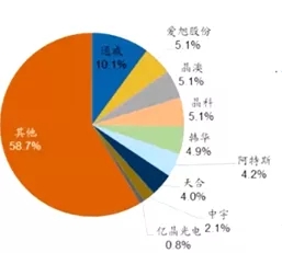 但是晶硅分為單晶硅和多晶硅,這兩者最大的區(qū)別是在于硅的純度和雜質(zhì)摻雜度。單晶硅具有較高的純度和較少的雜質(zhì),而多晶硅的純度較小且雜質(zhì)較多,所以單晶硅較多晶硅而言,單晶硅具有良好的導(dǎo)電性,同時(shí)也是主流的電池片。目前我國單晶硅市場份額占64.5%。這就說明在原材料的供應(yīng)上不存在瓶頸。