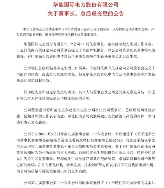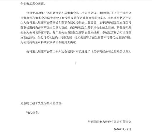 中國電力網(wǎng)訊 3月5日,華能國際電力股份有限公司發(fā)布公告,因工作需要,現(xiàn)任董事長、董事舒印彪和現(xiàn)任總經(jīng)理趙克宇于近日提交書面辭職報告,辭去相關職務。當日,公司董事會同意選舉趙克宇為公司第九屆董事會董事長和董事會戰(zhàn)略委員會主任委員。