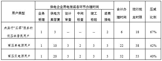 2. 對(duì)于居民用戶和實(shí)行“三零”服務(wù)的低壓非居民用戶,用電報(bào)裝壓減為受理簽約、施工接電2個(gè)環(huán)節(jié),在工作目標(biāo)中已規(guī)定全過程辦理時(shí)間。