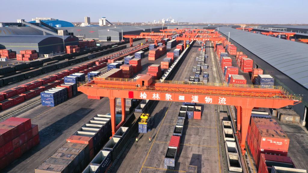 在榆林象道國(guó)際物流園集裝箱裝卸區(qū),工作人員在指揮裝卸外運(yùn)煤炭(無人機(jī)照片)。新華社記者 陶明 攝