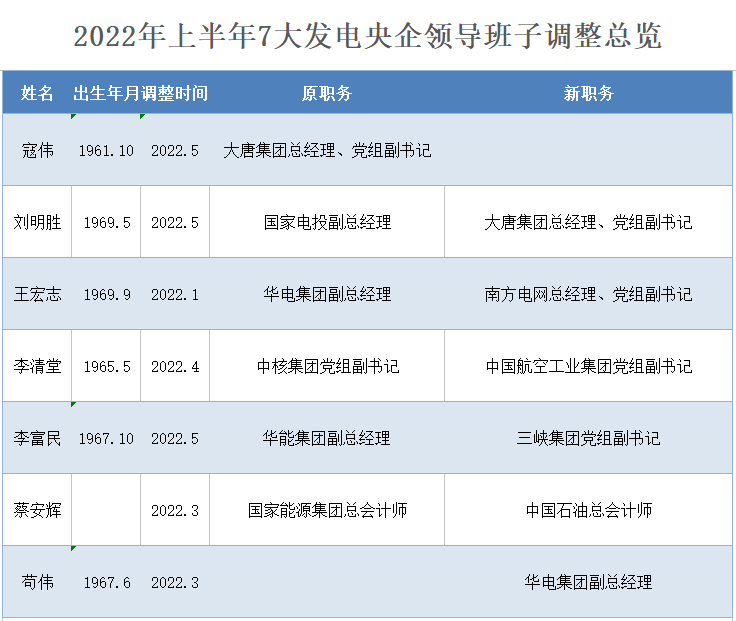 2022年上半年7大發(fā)電央企領(lǐng)導(dǎo)層人事變動