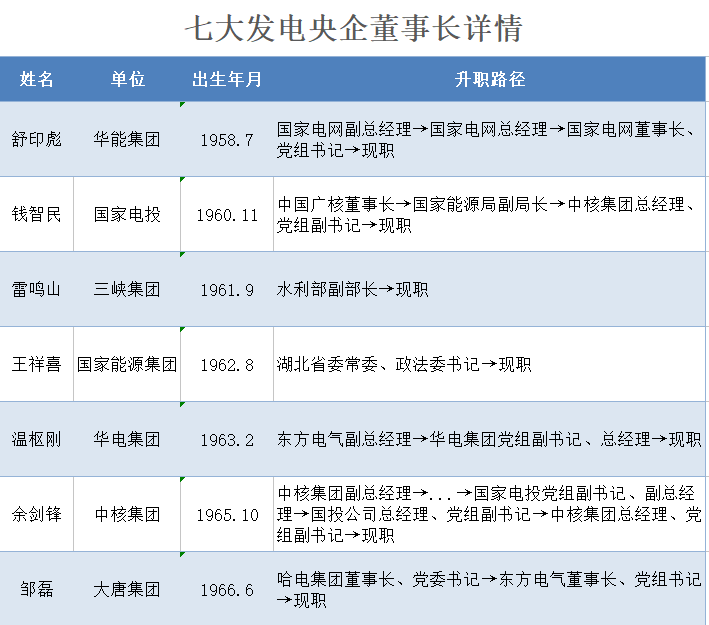 7位發(fā)電央企董事長的詳細(xì)檔案(按年齡排序)