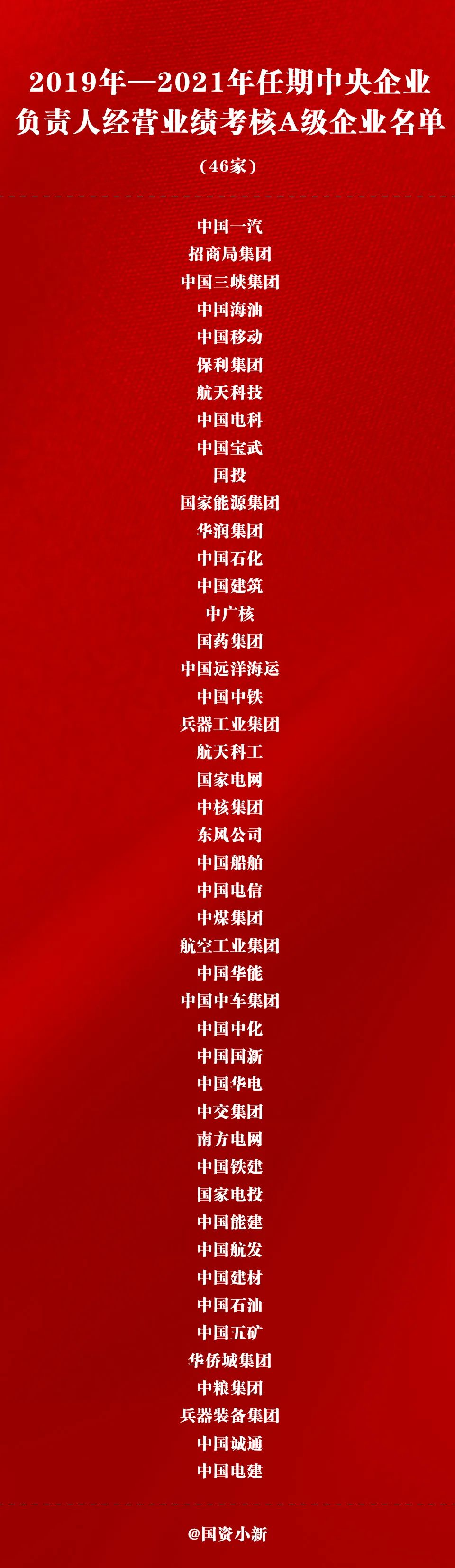 2021年度考核結果為A級的企業(yè)48家,2019-2021年任期考核結果為A級企業(yè)46家。