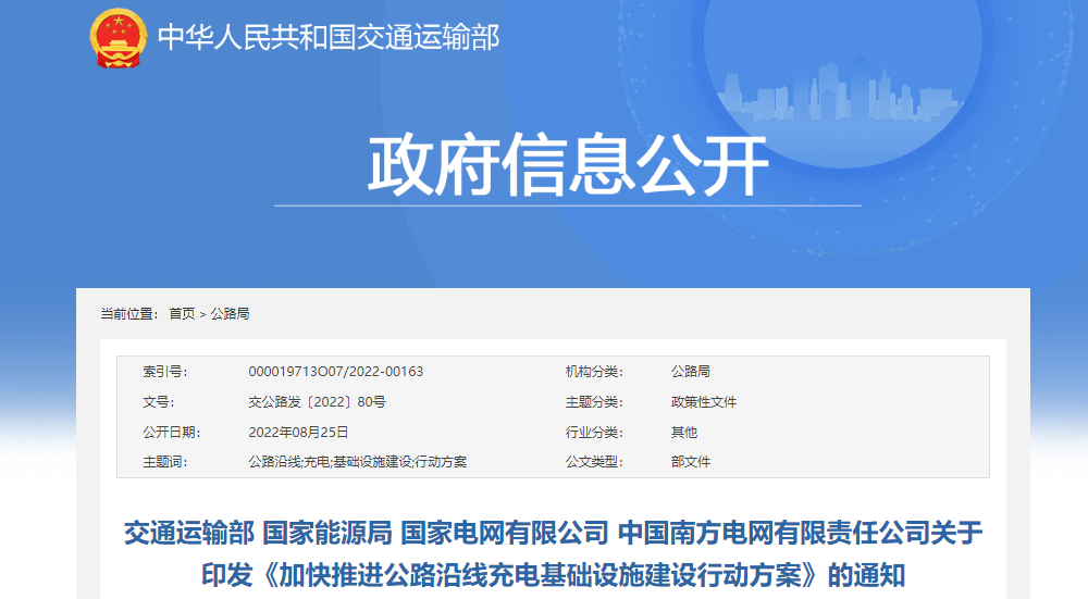 交通運(yùn)輸部 國(guó)家能源局 國(guó)家電網(wǎng)有限公司 中國(guó)南方電網(wǎng)有限責(zé)任公司關(guān)于印發(fā)《加快推進(jìn)公路沿線(xiàn)充電基礎(chǔ)設(shè)施建設(shè)行動(dòng)方案》的通知