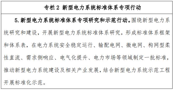 ——建立完善以光伏、風(fēng)電為主的可再生能源標(biāo)準(zhǔn)體系,研究建立支撐新型電力系統(tǒng)建設(shè)的標(biāo)準(zhǔn)體系,加快完善新型儲(chǔ)能標(biāo)準(zhǔn)體系,有力支撐大型風(fēng)電光伏基地、分布式能源等開發(fā)建設(shè)、并網(wǎng)運(yùn)行和消納利用。