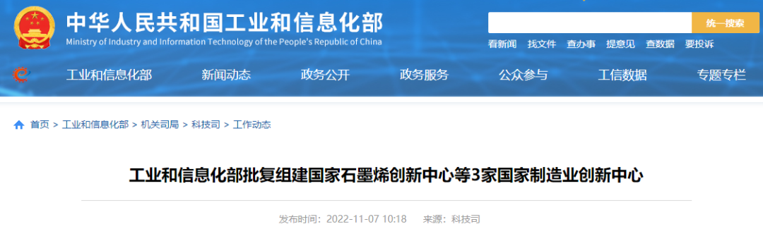 11月7日,工信部批復(fù)組建國家石墨烯創(chuàng)新中心等3家國家制造業(yè)創(chuàng)新中心。
