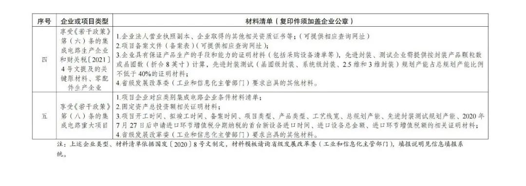 三、地方發(fā)改和工信部門根據(jù)企業(yè)條件和項目標準(附后),對企業(yè)申報的信息進行初核通過后,報送至國家發(fā)展改革委、工業(yè)和信息化部。《若干政策》第(一)、(三)、(六)、(七)條,以及財關(guān)稅〔2021〕4號文提及的集成電路產(chǎn)業(yè)的關(guān)鍵原材料、零配件生產(chǎn)企業(yè)清單,由國家發(fā)展改革委、工業(yè)和信息化部、財政部、海關(guān)總署、稅務總局進行聯(lián)審確認并聯(lián)合印發(fā)?!度舾烧摺返?八)條提及的集成電路重大項目,由國家發(fā)展改革委、工業(yè)和信息化部形成清單后函告財政部,財政部會同海關(guān)總署、稅務總局最終確定。