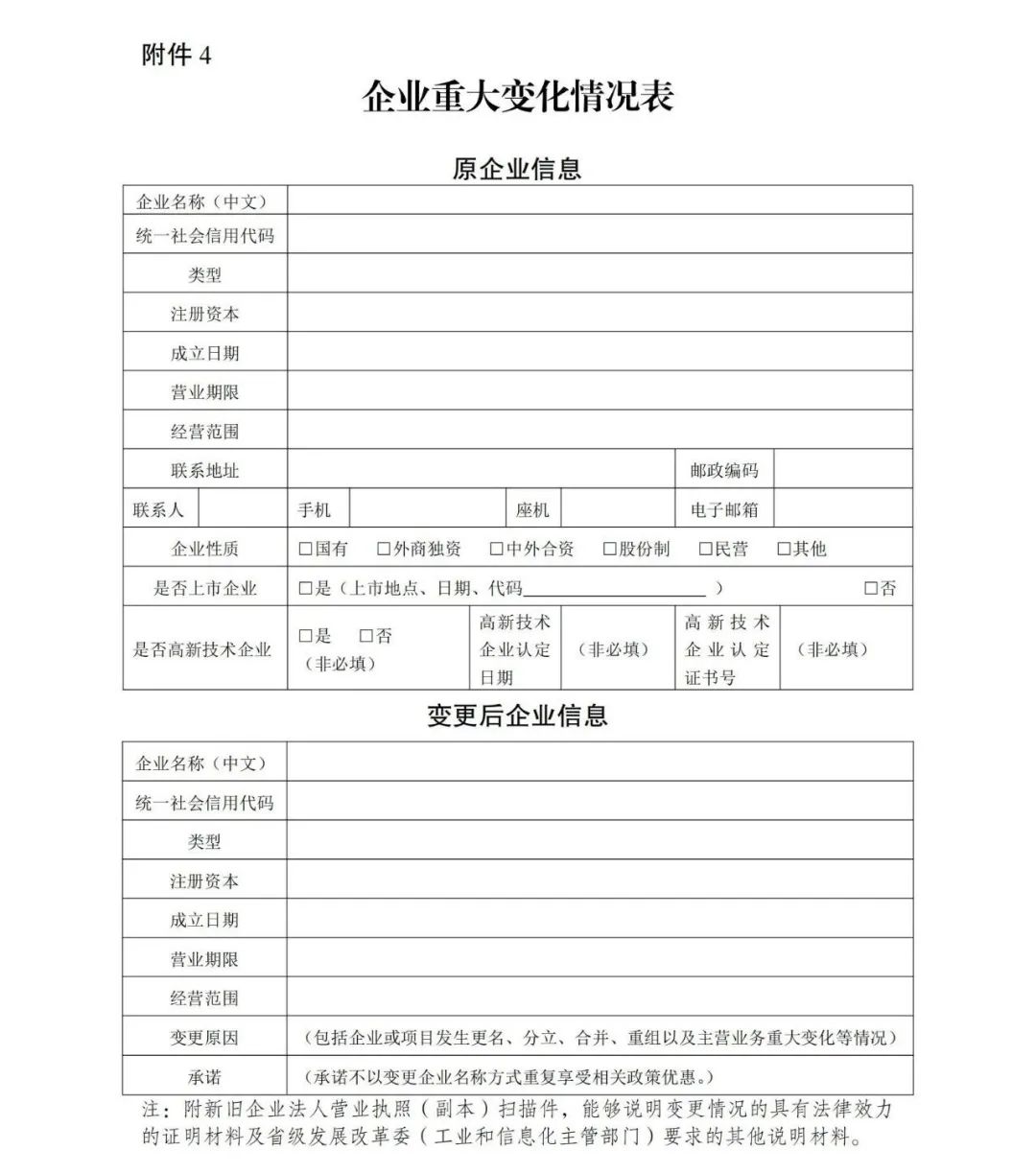 五、已享受《若干政策》第(一)、(三)、(六)、(七)條,以及財關(guān)稅〔2021〕4號文提及的關(guān)稅優(yōu)惠政策的企業(yè)或項目發(fā)生更名、分立、合并、重組以及主營業(yè)務重大變化等情況,應及時向地方發(fā)改和工信部門報告,并于完成變更登記之日起60日內(nèi),將企業(yè)重大變化情況表和相關(guān)材料報送國家發(fā)展改革委、工業(yè)和信息化部(以省級部門上報文件落款日為準)。國家發(fā)展改革委、工業(yè)和信息化部會同相關(guān)部門確定發(fā)生變更情形后是否繼續(xù)符合享受優(yōu)惠政策的企業(yè)條件或項目標準。