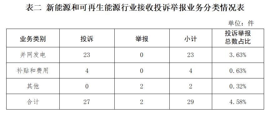 新能源和可再生能源行業(yè)排在第二位,數(shù)量為29件、占投訴舉報(bào)總數(shù)的4.58%,主要集中在并網(wǎng)發(fā)電、補(bǔ)貼和費(fèi)用等方面。(詳見(jiàn)表二)