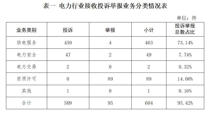 電力行業(yè)排在首位,數(shù)量為604件、占投訴舉報(bào)總數(shù)的95.42%,主要集中在供電服務(wù)、電力安全、電力交易、資質(zhì)許可等方面。(詳見(jiàn)表一)