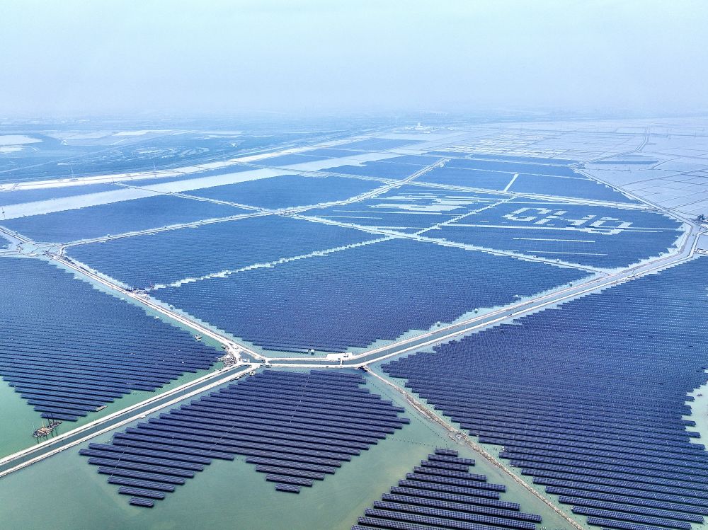 在北面的渤海海灣,一排排一眼望不到邊的光伏板在陽光下格外閃亮。光伏板下還“大有文章”,水面曬鹽、水下養(yǎng)殖,實現(xiàn)了一地三用。