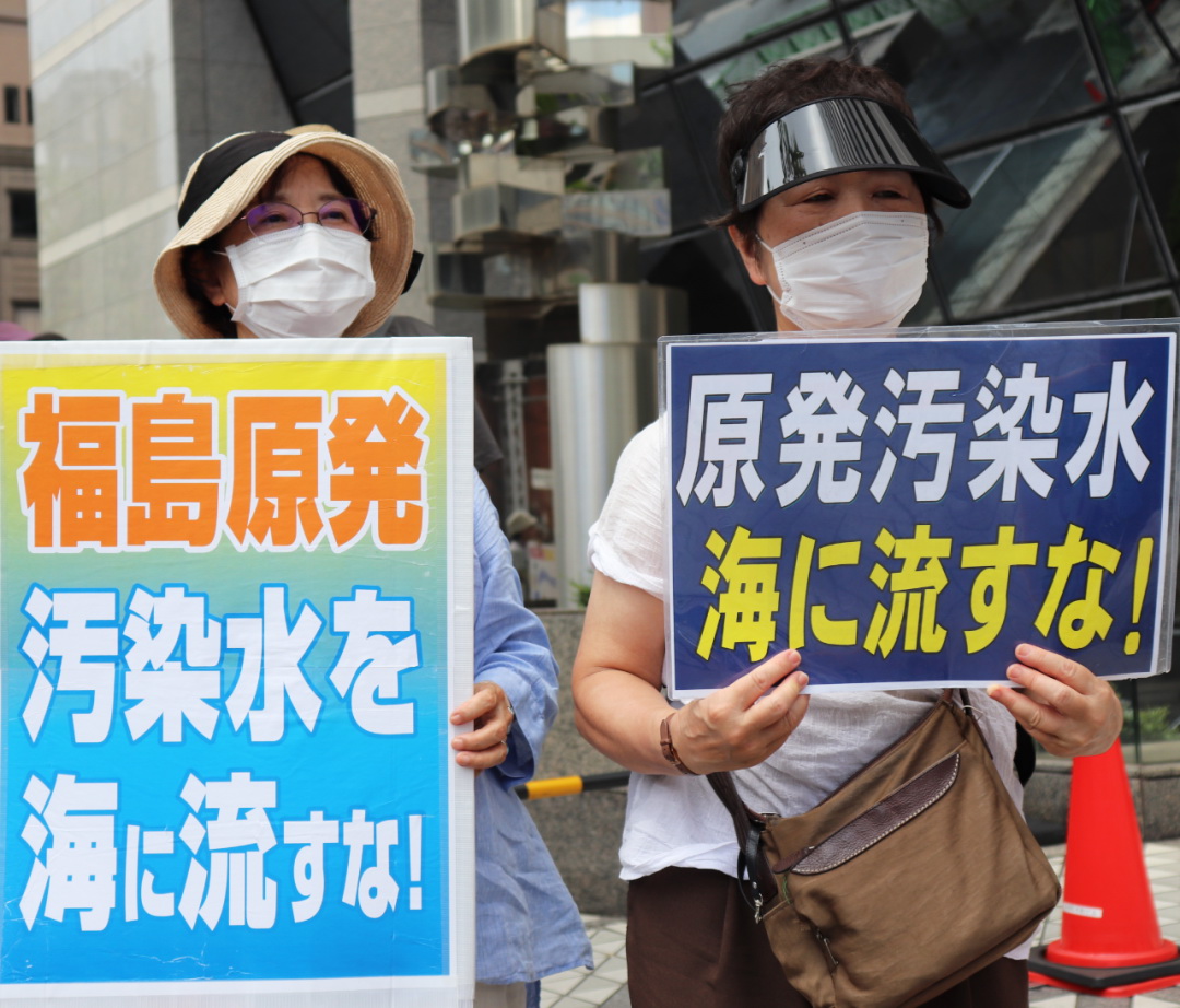 24日上午,上百名民眾在東電總部前緊急集會,抗議日本政府和東電啟動核污染水排海。