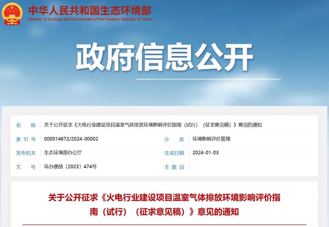 1月3日,生態(tài)環(huán)保部發(fā)布關(guān)于公開征求《火電行業(yè)建設(shè)項(xiàng)目溫室氣體排放環(huán)境影響評價指南(試行)(征求意見稿)》意見的通知。