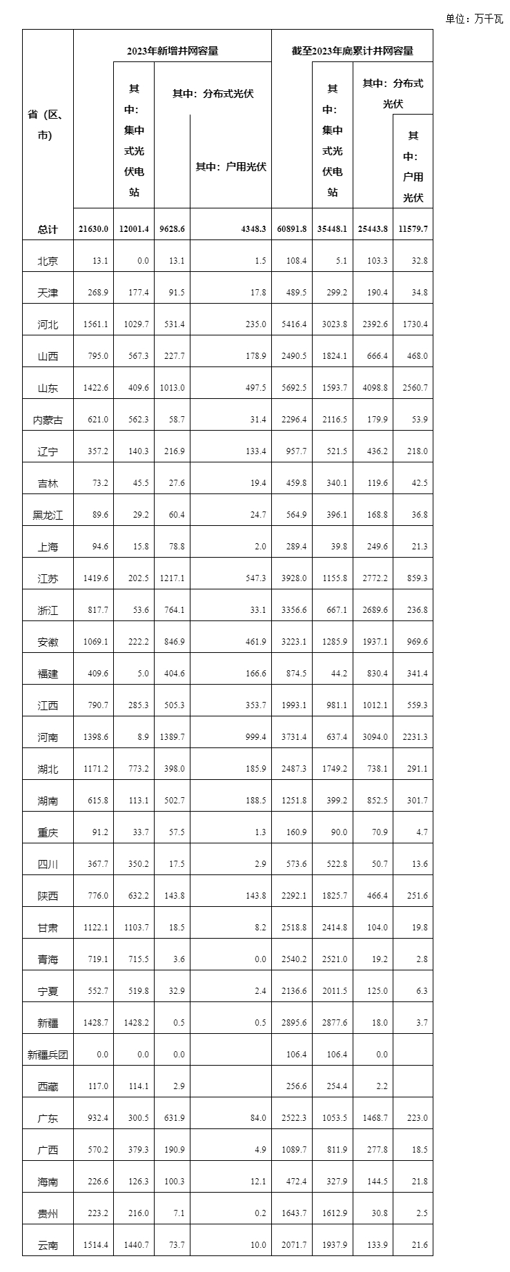 截至2023年底累計(jì)并網(wǎng)容量60891.8萬千瓦,其中集中式光伏電站35448.1萬千瓦,分布式光伏電站25443.8萬千瓦,戶用光伏11579.7萬千瓦。