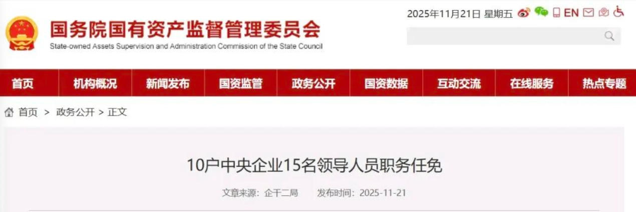 國務院國資委網站11月21日消息,10戶中央企業(yè)15名領導人員職務任免。