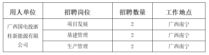 國家電投浙江分公司于2015年12月正式注冊成立,肩負(fù)著國家電力投資集團(tuán)有限公司在浙江區(qū)域的項(xiàng)目開發(fā)和發(fā)展重任。成立以來,已注冊多家項(xiàng)目公司,重點(diǎn)投資開發(fā)光伏、風(fēng)電、綜合智慧能源等項(xiàng)目。根據(jù)公司發(fā)展需要,現(xiàn)面向社會(huì)公開招聘公司所屬廣西國電投浙桂新能源有限公司相關(guān)人員,具體事項(xiàng)公告如下: