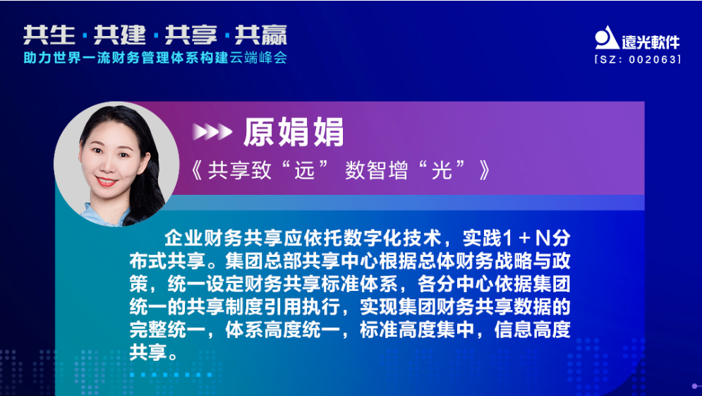 作為業(yè)界率先提出并在央企實(shí)踐“1+N”財(cái)務(wù)共享咨詢和信息化落地的廠商,遠(yuǎn)光軟件積累了諸多成功案例。原娟娟也在會(huì)上作了分享。