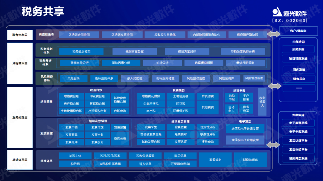 應(yīng)用先進(jìn)數(shù)字技術(shù)建立稅務(wù)標(biāo)準(zhǔn)體系,構(gòu)建全稅種、全業(yè)務(wù)屬性發(fā)票池,并通過搭建稅企直連通道服務(wù)建立全稅種智能辦稅平臺(tái),實(shí)現(xiàn)全稅種的計(jì)稅、報(bào)稅、繳稅、歸檔全流程智能化處理。同時(shí),通過引入稅務(wù)局的監(jiān)管和審計(jì)規(guī)則來構(gòu)建稅務(wù)稽查模型,實(shí)現(xiàn)360度的稅務(wù)風(fēng)險(xiǎn)掃描,全面助力集團(tuán)企業(yè)推進(jìn)稅務(wù)管理的標(biāo)準(zhǔn)化、數(shù)字化、共享化、智慧化轉(zhuǎn)型。