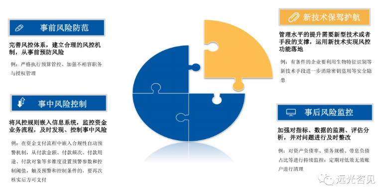 從信息化落地角度加強資金業(yè)務(wù)全面監(jiān)控,建議從四個維度展開:事前風(fēng)險防范、事中風(fēng)險控制、事后風(fēng)險監(jiān)控、新技術(shù)保駕護航。