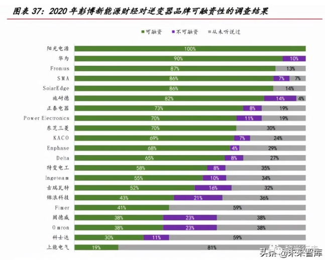 2020年彭博新能源財(cái)經(jīng)通過向可再生能源項(xiàng)目的投資方發(fā)放問卷等形式,對逆變器品牌的可融資性進(jìn)行了調(diào)查。排名較高的品牌意味著更易幫助項(xiàng)目開發(fā)商獲得銀行融資,利于綁定長期客戶群體;另一方面說明該品牌逆變器在產(chǎn)品質(zhì)量、運(yùn)行表現(xiàn)、售后服務(wù)支持和長期可靠性方面表現(xiàn)突出,利于海外布局的拓展。陽光電源以100%的得票率當(dāng)選“全球最具融資價值的逆變器品牌”,華為位居第2名,共有9家中國企業(yè)上榜。重要的是,該調(diào)查結(jié)果展現(xiàn)出國內(nèi)逆變器企業(yè)在海外擴(kuò)張業(yè)務(wù)的過程中,品牌價值得到提升,逐步得到海外投資方的認(rèn)可。