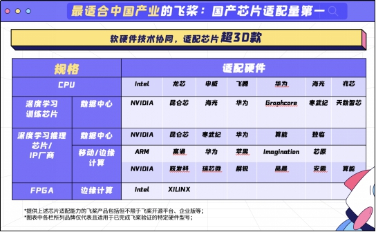 以百度飛槳為例,經(jīng)過(guò)對(duì)大量真實(shí)生產(chǎn)場(chǎng)景的反復(fù)打磨,已經(jīng)能夠使傳統(tǒng)企業(yè)在智能化轉(zhuǎn)型中實(shí)現(xiàn)高性能開(kāi)發(fā)、大規(guī)模訓(xùn)練、不同場(chǎng)景和不同軟硬件平臺(tái)敏捷部署。更重要的是,飛槳已經(jīng)和包括百度昆侖芯、華為昇騰、英特爾、英偉達(dá)在內(nèi)的22家國(guó)內(nèi)外硬件廠商,完成了31種芯片的適配和優(yōu)化,覆蓋全部國(guó)內(nèi)外主流芯片,最大程度幫助企業(yè)降本增效。