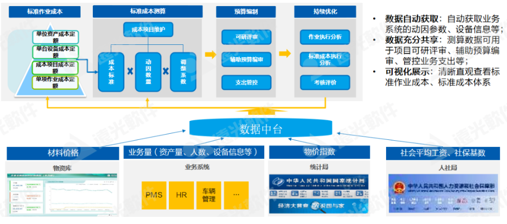 遠光軟件全面預(yù)算管理通過打造涵蓋各板塊、各業(yè)務(wù)的企業(yè)級成本標準庫,輔助企業(yè)預(yù)算編制,提高企業(yè)預(yù)算編制的準確性及公平性,并通過連接統(tǒng)計局、物價局相關(guān)數(shù)據(jù)指標,快速采集和更新動因數(shù)據(jù),實現(xiàn)標準成本的動態(tài)修編,提高標準成本體系的適用性、精準性。