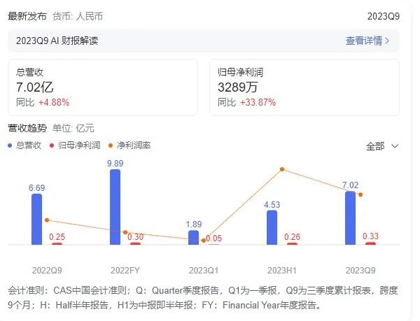 漢纜股份:2023三季報凈利潤7.06億 同比增長5.85%