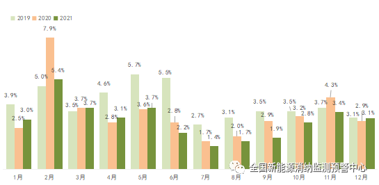 四季度,全國風(fēng)電發(fā)電量1831.8億千瓦時(shí),同比增長60.4%;光伏發(fā)電量764.6億千瓦時(shí),同比增長27.6%。全年風(fēng)電、光伏累計(jì)發(fā)電量9785億千瓦時(shí),同比增長35%,占全部發(fā)電量的比重達(dá)到11.7%,同比提升2個(gè)百分點(diǎn)。由于2020年底風(fēng)電、光伏發(fā)電集中并網(wǎng),2021年風(fēng)光發(fā)電量大幅提升,占全部發(fā)電量的比重有明顯增長。