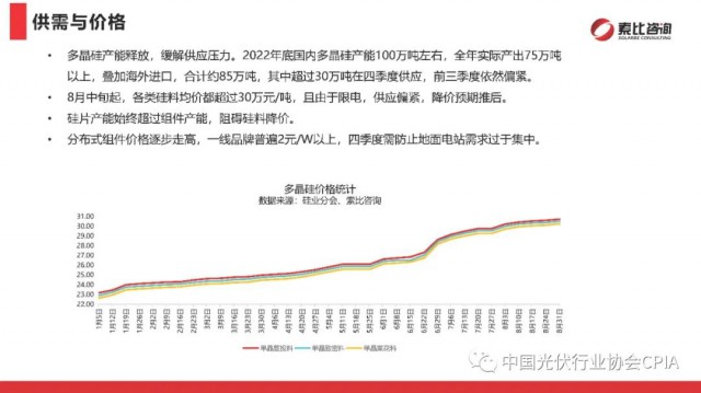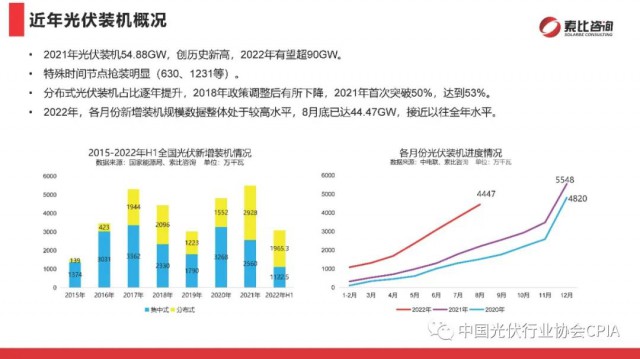 2022年9月27日,在中國光伏行業(yè)協(xié)會的指導和國內領先的分布式戶用企業(yè)支持下,由索比光伏網主辦的“2022年中國戶用光伏品牌大會暨中東部省份分布式項目開發(fā)研討會”在浙江寧波召開。索比光伏網副主編尹也澤對光伏供應鏈與分布式應用市場進行了回顧展望。尹也澤副主編分析,整體看,今年全年全國光伏發(fā)電新增裝機有望超過90GW,其中分布式光伏仍將占據“半壁江山”。