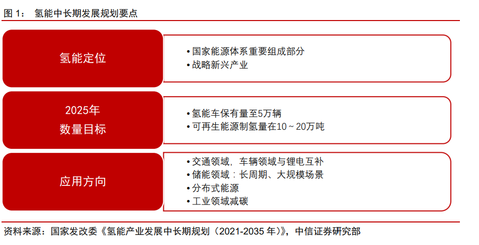 行業(yè)中長(zhǎng)期規(guī)劃對(duì)投資而言主要有三大核心要點(diǎn),包括氫能定位、未來(lái)發(fā)展目標(biāo)以及應(yīng)用方向。