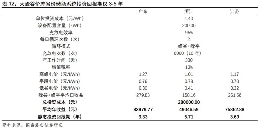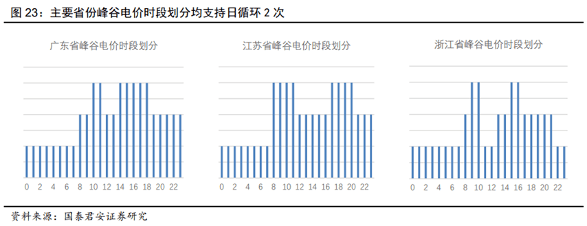 國(guó)內(nèi)用戶側(cè)的峰谷電價(jià)差套利,我們認(rèn)為主要體現(xiàn)在小工業(yè)和商業(yè)。按照地區(qū)分布,主要是長(zhǎng)三角和珠三角。儲(chǔ)能裝置的經(jīng)濟(jì)性體現(xiàn)在兩峰兩谷(平),每天可以有效充放電兩次的區(qū)域,比如廣東、浙江、江蘇等。