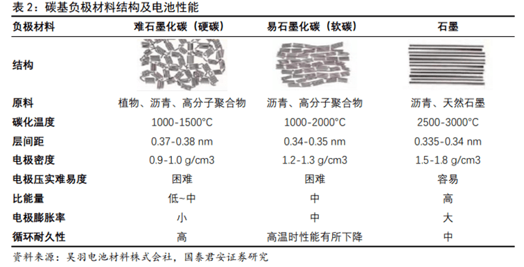 硬碳占據(jù)負(fù)極主流,改善首周循環(huán)效率為商業(yè)化關(guān)鍵。硬碳材料由于高比容量(300 mAh/g左右)、低儲(chǔ)鈉電壓(平臺(tái)段電壓在0.1V左右)、長(zhǎng)循環(huán)壽命、來(lái)源廣而被認(rèn)為是鈉離子電池最具商業(yè)化潛力的負(fù)極材料。目前,商業(yè)化的鈉離子電池所使用的負(fù)極幾乎都是硬碳,硬碳比石墨更易合成。