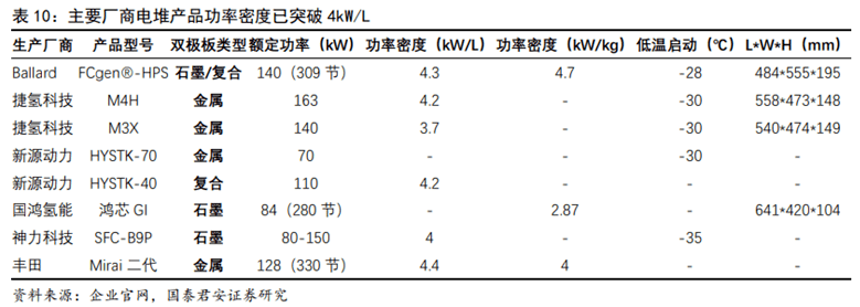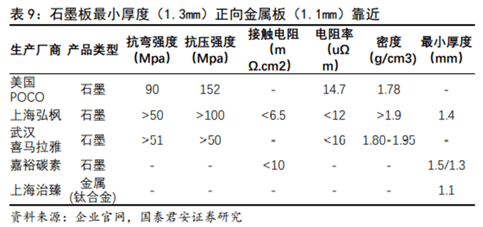 石墨板適應(yīng)需求趨于薄型化,乘用車為金屬板帶來(lái)機(jī)遇。石墨板:由于其高耐腐蝕性、高耐久性,以及相對(duì)較低的技術(shù)壁壘,率先實(shí)現(xiàn)國(guó)產(chǎn)化,在對(duì)體積較不敏感而對(duì)耐久性敏感的特種車、商用車領(lǐng)域示范應(yīng)用。然而,石墨雙極板的制作周期長(zhǎng)、機(jī)械性能差、加工難度大、制作成本高等劣勢(shì)也不可忽視。市場(chǎng)已有越來(lái)越多的企業(yè)成功開(kāi)發(fā)出超薄超精細(xì)石墨雙極板,提前突破了國(guó)家制定2025年前單組石墨雙極板厚度1.5mm的要求,功率密度開(kāi)始接近豐田第一代金屬雙極板的水平。金屬板:抗腐蝕性差,壽命過(guò)短是其應(yīng)用的阻礙,然而隨著涂層工藝的持續(xù)進(jìn)步與突破,其有望實(shí)現(xiàn)和石墨板相同的使用壽命。豐田汽車公司率先在旗下Mirai燃料電池汽車上使用金屬雙極板和涂層,解決了腐蝕、成本和導(dǎo)電等一系列問(wèn)題。憑借其機(jī)械性能優(yōu)異、高體積功率密度、成本低廉且易批量生產(chǎn)等優(yōu)勢(shì),金屬雙極板將在乘用車規(guī)?;瘧?yīng)用的進(jìn)程中實(shí)現(xiàn)突破。