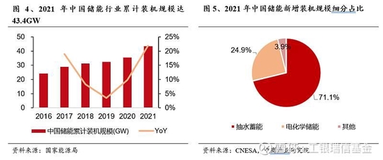 我國(guó)儲(chǔ)能市場(chǎng)穩(wěn)步擴(kuò)容,電化學(xué)儲(chǔ)能份額增長(zhǎng)明顯。在新能源發(fā)電規(guī)模大幅增長(zhǎng)的推動(dòng)下,我國(guó)儲(chǔ)能裝機(jī)規(guī)模一直保持高速增長(zhǎng)的趨勢(shì)。根據(jù)國(guó)家能源局?jǐn)?shù)據(jù),2021年中國(guó)儲(chǔ)能市場(chǎng)累計(jì)裝機(jī)功率位居全球第一,為43.4GW,同比增長(zhǎng)21.9%,2016-2021年儲(chǔ)能累計(jì)裝機(jī)量年均復(fù)合增長(zhǎng)率為12.3%。2021年我國(guó)抽水蓄能新增裝機(jī)5.2GW,占比71.1%;電化學(xué)儲(chǔ)能新增裝機(jī)1.8GW,占比24.9%,較2020年占比9.2%增幅較大,電化學(xué)儲(chǔ)能市場(chǎng)份額增長(zhǎng)明顯。