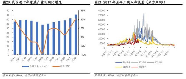 確保能源安全穩(wěn)定供應(yīng),煤電扛起保供重任。2023 年 4 月《2023 年能源工作指導(dǎo)意見》發(fā)布,不同于 2021 年指導(dǎo)意見中將“能源結(jié)構(gòu)”放在了目標(biāo)首位,國家能源局已經(jīng)連續(xù)兩年堅持把“增強供應(yīng)保障能力”放在主要目標(biāo)首位。由此可見,自 2021 年起頻發(fā)的缺電事件使人們意識到能源保供需求刻不容緩,而我國以煤為主的資源稟賦,決定了煤電在相當(dāng)長時期內(nèi)仍將承擔(dān)保障我國能源安全的重要作用。從數(shù)據(jù)來看,煤炭方面,在能源保供要求下國家通過核增產(chǎn)能、擴(kuò)產(chǎn)、新投產(chǎn)等方式持續(xù)新增煤炭產(chǎn)能,據(jù)國家統(tǒng)計局,2022 年我國實現(xiàn)煤炭產(chǎn)量 45.6 億噸,同比增長 10.5%,為近十年來最高增速。煤電方面,去年夏季以來,降水偏枯造成水電發(fā)電量持續(xù)出力不足,2022 年下半年至 2023 年上半年三峽水庫日均流入量為近五年來同期低位,據(jù)國家統(tǒng)計局,2023 年 1-6 月我國水力發(fā)電量同比下降 22.9%。為彌補水力發(fā)電不足,2023 年 1-6 月我國火力絕對發(fā)電量達(dá)到 29457 億千瓦時,同比增長 7.5%,占上半年總發(fā)電量的 71%。