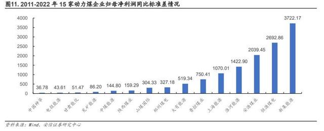 2)抵御周期方面,中國神華的煤電一體也一定程度熨平了煤、電行業(yè)周期波動,2011-2015年,受經(jīng)濟(jì)增長動能弱化、煤炭行業(yè)產(chǎn)能逐漸過剩影響,煤價整體波動向下,同時期公司煤炭分部毛利率由 32%下降至 16%,而發(fā)電分部因成本改善毛利率由 24%上升至 36%。根據(jù)中國煤炭協(xié)會的統(tǒng)計,2015 年煤炭行業(yè)虧損面已超過八成,而中國神華依舊實現(xiàn)歸母凈利潤161.44 億元,凈利率 13.14%,位列當(dāng)年動力煤(中信)板塊公司榜首。2021-2022 年在火電企業(yè)大幅虧損的局面下,公司發(fā)電分部憑借穩(wěn)定煤源依舊實現(xiàn)毛利率 7.7%和 14.3%。在此基礎(chǔ)上,中國神華的煤炭業(yè)務(wù)與發(fā)電業(yè)務(wù)形成良好對沖,一定程度加強了業(yè)績的穩(wěn)定性。我們選取 Wind 中主業(yè)為動力煤的 15 家上市公司作為樣本,計算其 2011-2022 年歸母凈利潤同比變動標(biāo)準(zhǔn)差。結(jié)果顯示中國神華的同比變動標(biāo)準(zhǔn)差最小,側(cè)面反映其盈利穩(wěn)定性。此外,據(jù)《煤電一體化深度融合發(fā)展的國神路徑研究》(2020)的分析,國家能源集團(tuán)旗下國神公司的煤電一體化項目除了通過傳統(tǒng)方式建設(shè)坑口電廠,減少煤炭流通環(huán)節(jié)實現(xiàn)內(nèi)部降本外,還通過水汽互補利用,燃料經(jīng)濟(jì)摻燒等創(chuàng)新方式降低生產(chǎn)成本,提高產(chǎn)業(yè)協(xié)同效應(yīng)。
