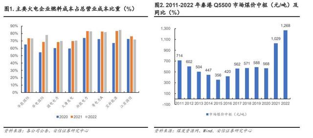 據(jù)煤炭資源網(wǎng),2021 年秦皇島港動力煤 Q5500 平倉價中樞達(dá)到 1029 元/噸,較 2020 年價格中樞 568 元/噸上漲約 81%。2022 年,在俄烏沖突、極端高溫天氣、煤炭新增產(chǎn)能釋放有限等多重因素影響下,煤價持續(xù)高位運行,秦皇島港動力混煤 Q5500 平倉價全年價格中樞抬升至1268 元/噸,同比提高約 23%,直接導(dǎo)致 2021-2022 年火電企業(yè)燃料成本占比大幅提升,火電企業(yè)業(yè)績承壓。