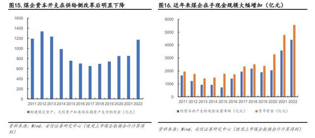 “雙碳”目標(biāo)下,煤企轉(zhuǎn)型具備先天產(chǎn)業(yè)優(yōu)勢、地域優(yōu)勢且資金充足。一方面,煤企具有產(chǎn)業(yè)優(yōu)勢,具備能源開采、裝備制造的成熟經(jīng)驗,擁有穩(wěn)定的下游電廠、化工客源,以及先天地域優(yōu)勢。我國大型新能源項目基地多數(shù)位于西北地區(qū),與煤炭資源分布重合度較高,如我國第一批容量約 1 億千瓦的大型風(fēng)電光伏基地主要位于甘肅、青海、內(nèi)蒙、寧夏等西部地區(qū)。此外,與傳統(tǒng)能源相比,新能源占地面積大。隨著新能源規(guī)??焖贁U(kuò)大,土地資源已經(jīng)成為影響新能源發(fā)展的重要因素,煤炭企業(yè)可利用自有采煤沉陷區(qū)受損土地規(guī)劃建設(shè)光伏發(fā)電、風(fēng)力發(fā)電等新能源項目,提高資源利用率的同時還可實現(xiàn)綠色轉(zhuǎn)型。另一方面,受制于 2011-2013 年行業(yè)產(chǎn)能過剩以及 2016 年以來的供給側(cè)結(jié)構(gòu)性改革,煤炭行業(yè)資本開支明顯下降,2021 年至今雖在行業(yè)景氣度好轉(zhuǎn)以及政策鼓勵保供穩(wěn)價背景下有所回升,但在“雙碳”目標(biāo)持續(xù)推進(jìn)下,煤炭固定資產(chǎn)投資規(guī)模大、時間長,資本開支仍低于此前水平,且新礦井的使用時間一般長達(dá)數(shù)十年之久,長期來看與雙碳背景相違背,企業(yè)進(jìn)行煤炭固定資產(chǎn)投資的意愿不強。但近兩年煤價高位運行,使得煤炭企業(yè)盈利能力持續(xù)改善,在手現(xiàn)金規(guī)模大幅增加,為后續(xù)轉(zhuǎn)型提供基礎(chǔ)。