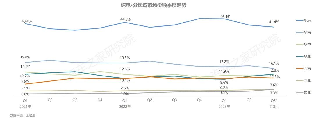 從區(qū)域角度上看,以長三角為代表的華東地區(qū)是中國發(fā)展的重要引擎,匯聚多個經(jīng)濟發(fā)達的省、市,更高的本地居民收入與完善的充電基礎(chǔ)設(shè)施配套,促使當(dāng)?shù)叵M者對新能源純電汽車更加旺盛的購車需求,其市場份額長期保持在40%以上,成為新能源純電車型最為重要的區(qū)域市場;華南地區(qū)以16%左右的份額位居第二;華中、華北、西南市場占比均在12%左右,份額十分相近;西北、東北市場占比尚不足5%。