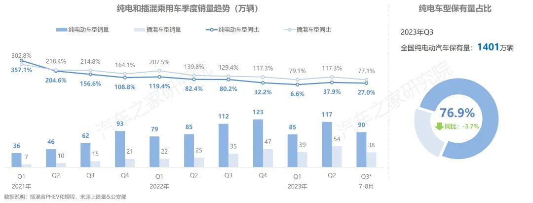 從新能源市場發(fā)展的趨勢上看,隨著技術(shù)的日漸成熟與明星車型的不斷涌現(xiàn),插混及增程車型的市場銷量增速長期處于領(lǐng)跑位置,純電車型市場增速相對較弱。而從絕對增量與存量兩個角度上看,新能源市場的大部分份額仍由純電車型所占據(jù),但市場正處于被緩慢的蠶食之中,目前全國純電動汽車保有量為1400萬輛,占全部新能源車保有量的近77%。