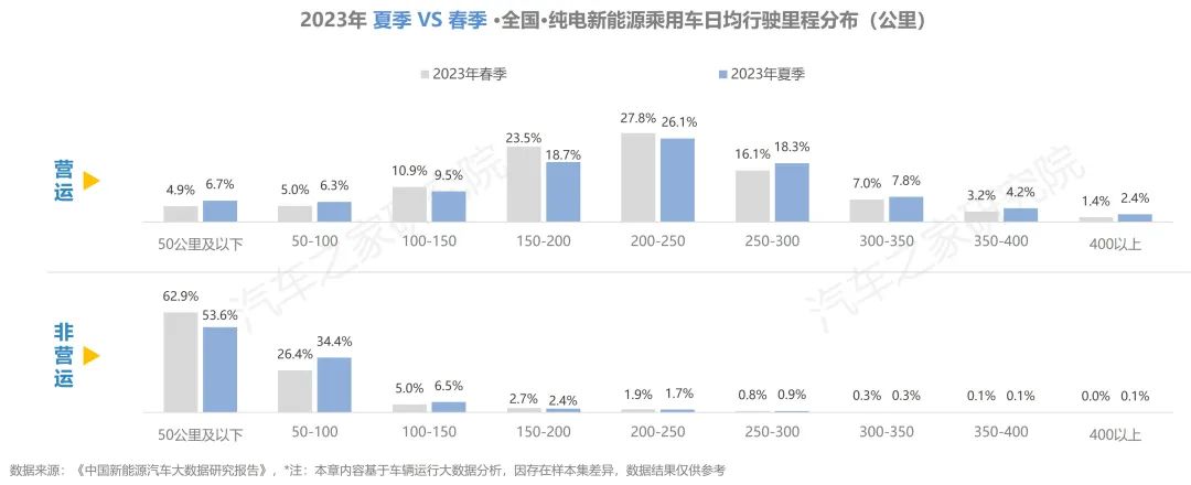 與去年同期相比,純電車輛在行駛里程有所增加,在出行天數(shù)與行駛時長方面,同去年夏季相比大體持平。而從不同車輛性質(zhì)對比上看,營運車輛的使用強度遠超非營運車輛,兩者在行駛里程方面相差超6倍,在日均時長則亦有近5倍的差距。